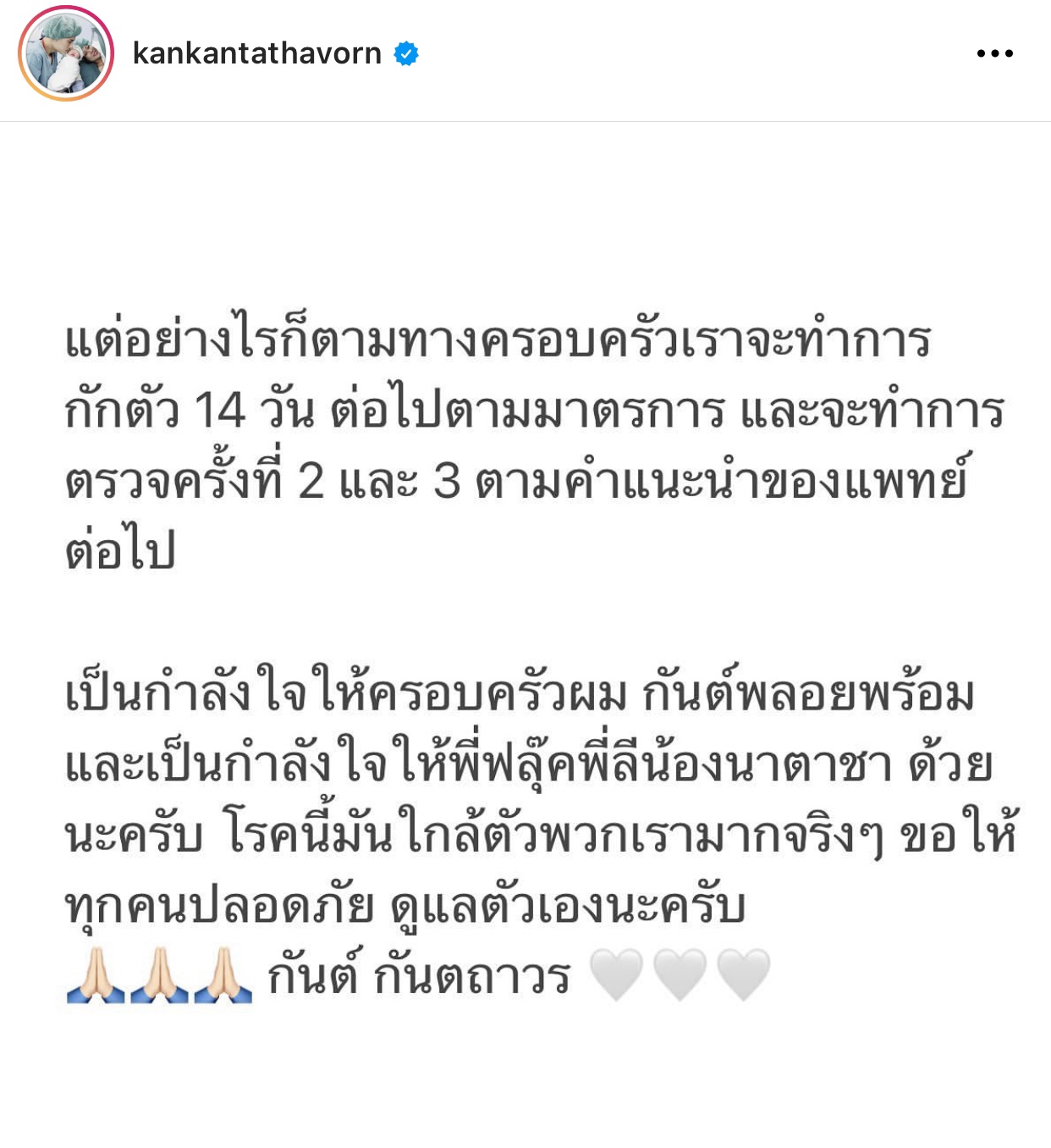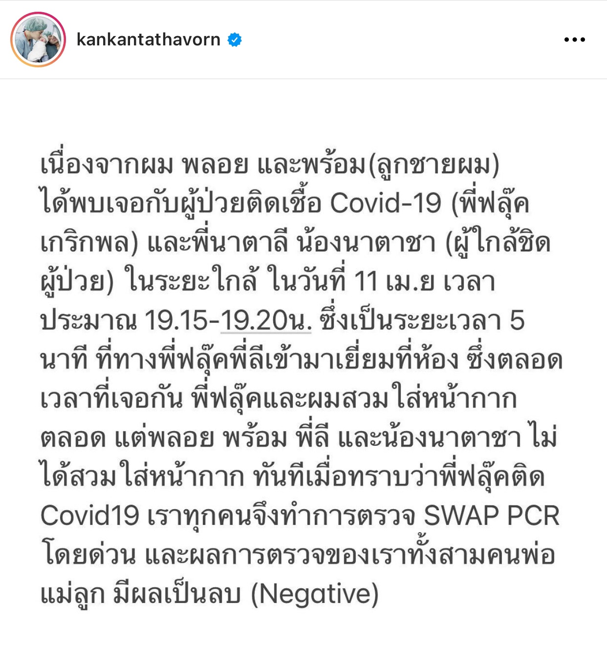 ជាក់ស្ដែង Kan បានចេញមកនិយាយបញ្ជាក់ពីសេចក្ដីនៅក្នុង IG ថា “ក្រៅពីខ្ញុំនិង Ploy ព្រមទាំងកូនប្រុសបានជួបជាមួយនិងអ្នកឆ្លងកូវីដ (Fluke Krirkphol) ហើយបង Natalie ប្អូន Natasha (អ្នកជាប់អ្នកទាក់ទងនិងអ្នកជម្ងឺ) ក្នុងរយៈជិត