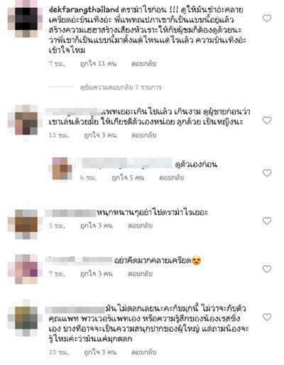 តែថានៅខាងក្រោមផុសដូចគ្នានោះគឺ បែរជាមានអ្នកបណ្ដាញសង្គមមួយចំនួនចូលទៅ comment បង្ហាញការយល់ឃើញចំពោះភាពមិនសក្ដ័សមដែល Pat Napapa សម្ដែងចេញមិនថា “វាមិនកំប្លែងទាល់តែសោះចំពោះរឿងនេះ មិនថាចំពោះខ្លួន លោក Power Patch ឬក៏អារម្មណ៍របស់កូនប្រុសផ្ទាល់ ពេលខ្លះវាអាចជាភាពសប្បាយរីករាយរបស់មនុស្សចាស់ តែមានសួរក្មេងទេថាជាការកំប្លែង” ហើយ ” Pat ខ្លាំងពេកហើយ ហួសហេតុការងារ មើលខាងប្រុសផងថាគេលែងជាមួយអត់ អោយកិត្តយសខ្លួនឯងខ្លះផង កូនផងដែរ ជាមនុស្សស្រី”