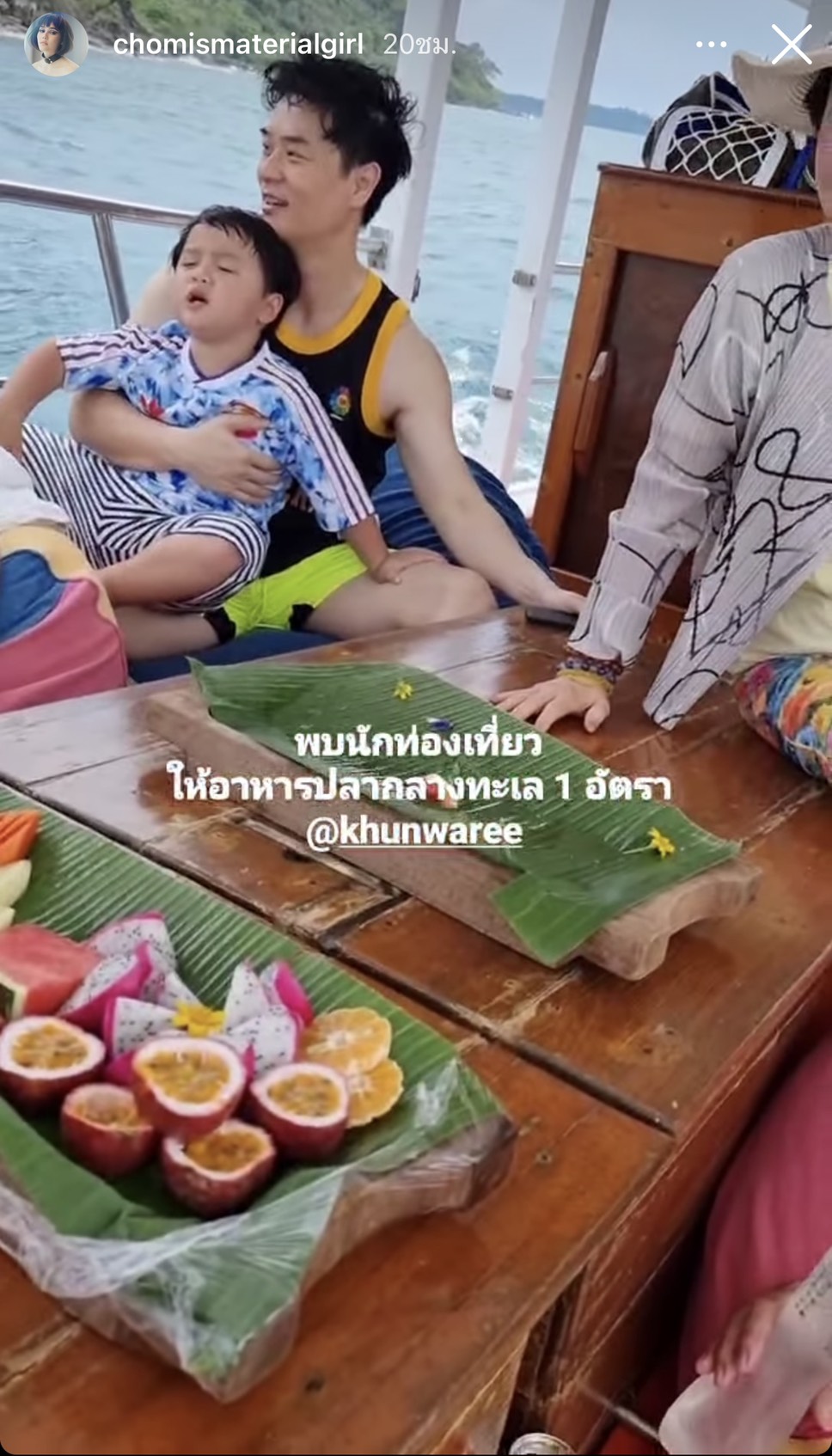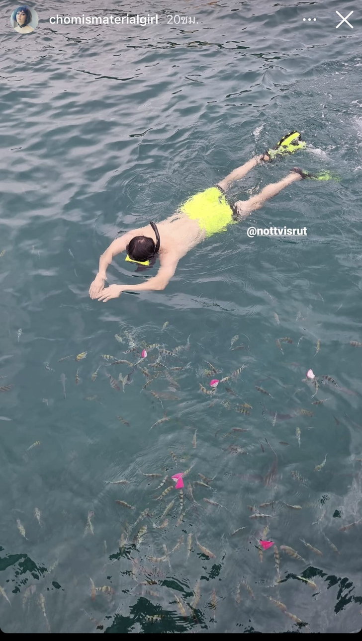 ហើយបរិយាកាសដ៏សែនល្អ ដែរម៉ែ Chompoo បានថតផុសនៅក្នុង story ពេលដែលចុះទូកទៅលេងទឹកសមុទ្រ ហើយថែមទាំងមានរូបភាពរបស់ Nottvisrut ដែលកំពុងហែលទឹកមើលហ្វូងត្រី ក៏អាចបានឃើញវគ្គស៊ិចស៊ីរបស់លោកស្វាមីដោះអាវហែលសាច់សខ្ចីជាងក្រមុំៗទៅទៀត
