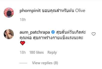 ពីររូបថតដែលគ្មានចំណែក តែខាងលោកប៉ាបានថេកអគុណ Aum តាមរយៈ IG ជាមួយនិងរូបដើម Olive ក្រអូប ព្រមទាំងប្រាប់ទៀតថា “អគុណសម្រាប់ដើម  Olive”  ខាង Aum ក៏បានចូលទៅសរសេរពាក្យជូនពរយ៉ាងគួអោយស្រលាញ់និងរំភើបចិត្ត “រីករាយថ្ងៃកំណើតចាលោកប៉ា សុខភាពល្អនិងរឹងមុំាណាចា”