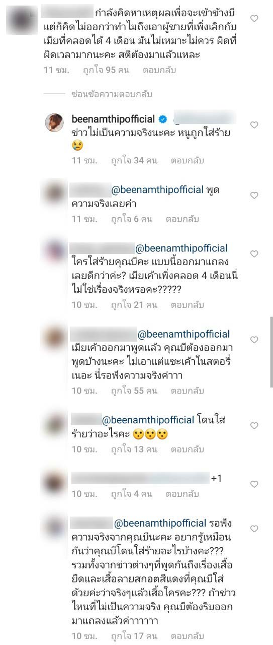ថ្មីៗនេះខណៈពេលដែល Bee Namthip បានផុសរូបភាពខ្លួនឯងប្រូម៉ូតភេសជ្ជៈនៅក្នុង IG @beenamthipofficial ហើយក៏មានអ្នកបណ្ដាញសង្គមម្នាក់ចូលទៅ comment ដាស់សតិថា “កំពុងគិតរកហេតុផលក្នុងការចូលខាង Bee តែក៏គិតមិនចេញថាហេតុអ្វីទើបយកប្រុសដែលទើបនិងបែកគ្នាជាមួយប្រពន្ធទើបនិងសម្រាលកូនបាន 4ខែ នោះវាមិនសក្ដិសម មិនគួទេ ខុសកន្លែងខុសពេលវេលាខ្លាំងណាស់ សតិត្រូវតែមានដឹងទេ”