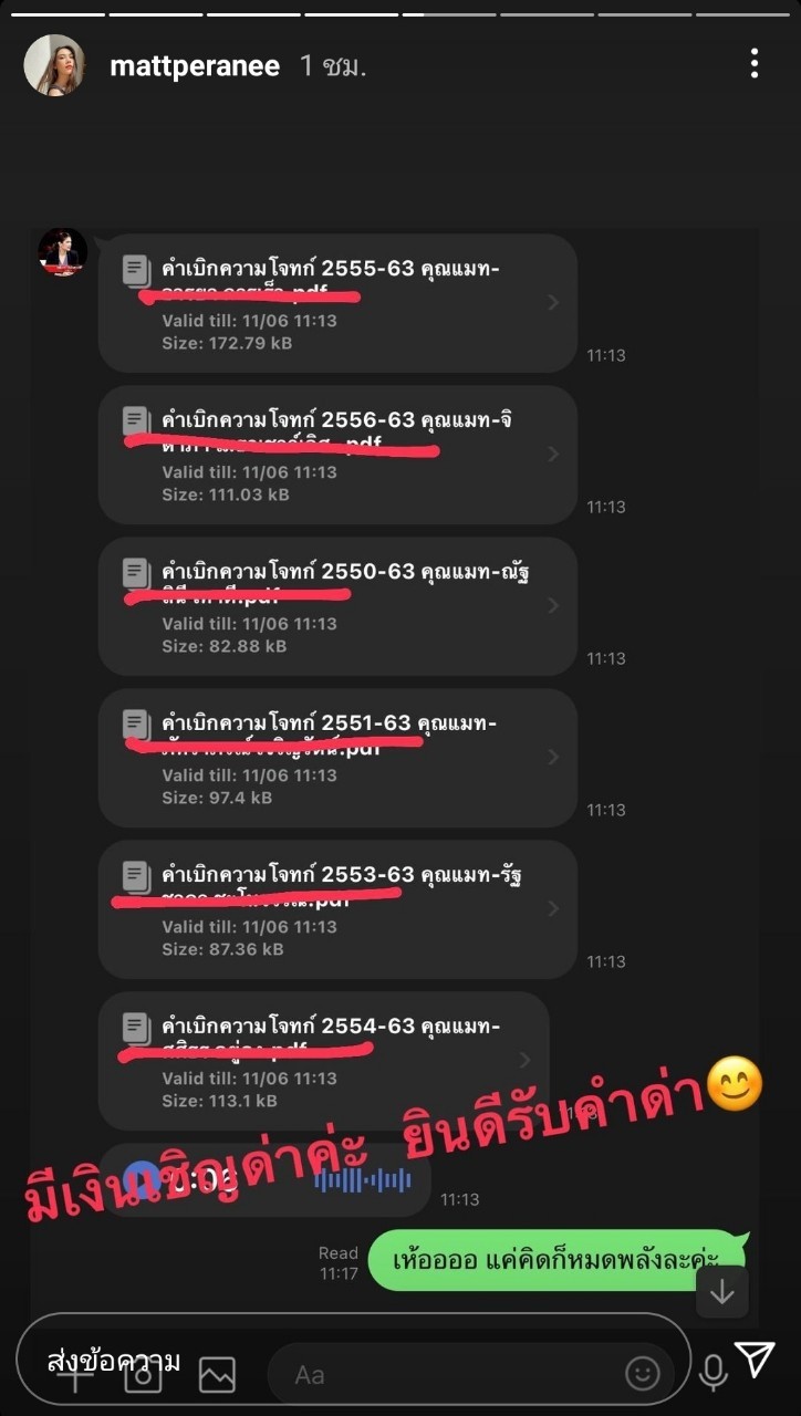 ហើយថ្មីៗនេះ Matt Peeranee ក៏បានបង្ហាញរូបភាពដែលនាងបានអោយមេធាវីប្រមូលផ្ដុំធ្វើជាភស្ដុតាងដើម្បីធ្វើពាក្យបណ្ដឹងបុគ្គលដែលចូលមករករឿងជេរប្រមាថខាងបណ្ដាញអនឡាយម្ដងទៀត ព្រមទាំងបន្ថែមឃ្លាច្បាស់ៗថា “សំបូរលុយណាស់អញ្ជើញជេរចុះចា រីករាយនិងទទួលពាក្យជេរចា” “សំបូរលុយណាស់អញ្ជើញខាំចា រីករាយនិងទទួលការខាំចា”