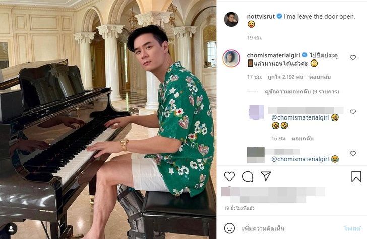 ហើយរូបភាពជាក់ស្ដែងដែលប៉ា Nott Witsarut ផុសគូជាមួយនិងព្យាណូក្នុងផ្ទះដ៏ទំនើប ព្រមជាមួយនិងឃ្លាដែលនិយាយពីសាច់ភ្លេងថា “I’ma leave the door open” ហើយ comment អ្នកបណ្ដាញសង្គមនាំគ្នាសរសើរពីភាពសង្ហារបស់ប៉ាៗដល់ថ្នាក់ម៉ាក់ Chompoo ត្រូវប្រញាប់ចូលទៅ comment ដែលរថា “ទៅបិតទ្វា ហើយឡើងមកដេកបានហើយចា”