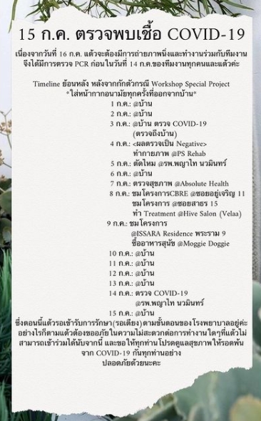 ដោយថ្មីៗនេះ Taew បានប្រកាសរឿងនេះនៅក្នុង IG ដោយបានររៀបរាប់ថា 15 កក្កដា ពិនិត្យឃើញមាន COVID-19 បន្ទាប់ពីថ្ងៃទី 16 កក្កដា Taew បានទៅធ្វើការថតរូបភាពសន្លឹកស្ងៀមហើយធ្វើការរួមជាមួយនិងក្រុមការងារ ទើបមានការពិនិត្យ PCR មុនថ្ងៃទី 14 កក្កដា របស់ក្រុមការងារគ្រប់គ្នាហើយនិងខ្លួន Taew ចា