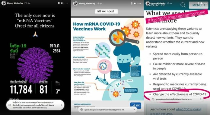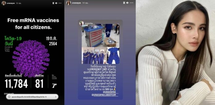ទ្រាំលែងបាននិងឃើញមនុស្សឆ្លងកូវីដថ្មីក្នុងប្រទេសថៃកើនឡើងខ្ពស់ នៅថ្ងៃទី 19 កក្កដា 2021 មានចំនួន 11,784 នាក់ ហើយចំនួនអ្នកបាត់បង់ជីវិត 81​នាក់ តារាសម្ដែងស្រី Yaya Urassaya ផុសនៅក្នុង IG story រឿងអ្នកឆ្លងកូវីដនិងចំនួនអ្នកស្លាប់ច្រើន ព្រមជាមួយសារជាភាសាអង់គ្លេសទាមទារវ៉ាក់សាំង mRNA ផ្ដល់ជូនប្រជាជនឥតគិតថ្លៃ ដោយថា Free mRNA vaccines for all citizens