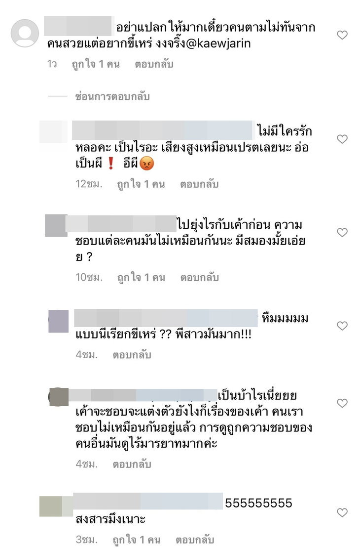 តែជាក់ស្ដែងបែរជាមានរឿងខ្វល់ខ្វាយក្នុងចិត្ត បន្ទាប់ពី Kaew Charinya ផុសរូបនៅក្នុង IG ហើយមកជួបនិងអ្នកចិត្តចង្អៀតមួយក្រុមចូលទៅ comment រិះគន់ម៉ូតសក់ហើយនិងការតែងខ្លួនរបស់នាងថាធ្វើខ្លួនចំលែកតាមប្ដី តាមប្រយោគថា