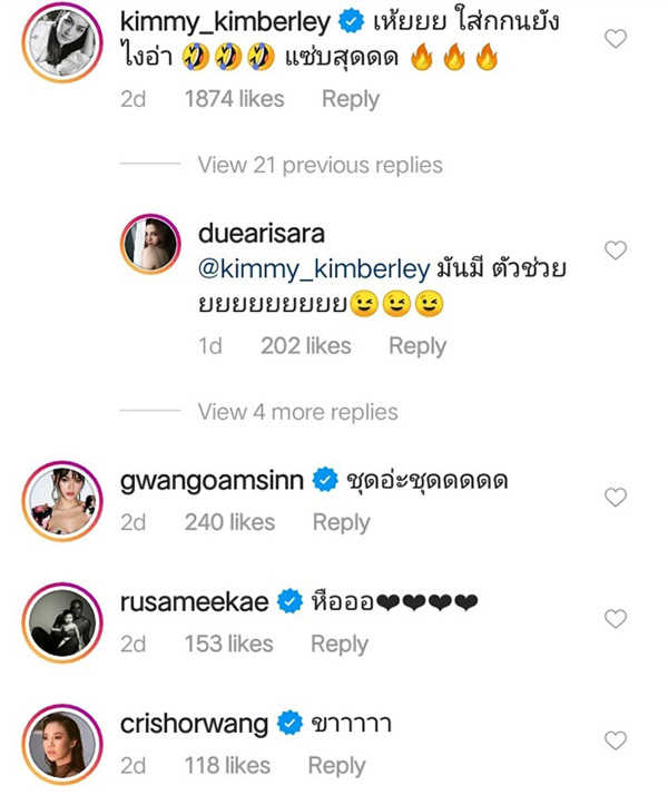 ច្បាស់ណាស់ថាគ្រប់គ្នាដែលតាមដាននាងនៅក្នុង IG មិនថាជាមិត្តភ័ក្ដឬអ្នករួមការងារ ឬហ្វេនៗអ្នកគាំទ្រនោះទេ សុទ្ធតែភ្នែកក្លាយជាទីទុយអស់ហើយ សូម្បីតែកញ្ញា Kimberly ក៏កើតការឆ្ងល់និងសួរមិនសំចៃទឹកចិត្តសាម៉ីខ្លួនចូលទៅ comment សួរថា “អើយៗៗ ស្លៀកខោវក្នុងយ៉ាងម៉េច ស៊ិចស៊ីខ្លាំងណាស់”