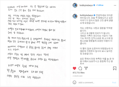 ដោយមុននេះតារាប្រុសដួងនេះគឺមិនបាននិយាយពីរឿងមានចំណងស្នេហាឲអ្នកគាំទ្របានដឹងនោះឡើយ តែសម្រាប់តែប្រកាសដំណឹងក្លាយជាឪពុកគេហើយ។ យ៉ាងណាក៏ដោយដំណឹងលេចធ្លាយជិតរៀបការរបស់ Bobby សមាជិកក្រុម IKON គឺមិនមែនដឹងតាមរយះសារពត៌មានបង្ហោះដូចគូតារាផ្សេងទេ តែរូបលោកផ្ទាល់ជាអ្នកសសេរសំបុត្រប្រាប់ពីដំណឹងរីករាយរបស់ខ្លួនលើកនេះ ធ្វើឲអ្នកគាំទ្រជាច្រើនបាន Comment ជូនពរលោកវិញផងដែរ។