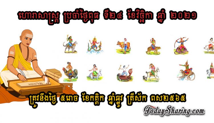 ហោរាសាស្រ្ត ប្រចាំថ្ងៃ ពុធ ទី ២៤ ខែ វិច្ឆិកា ឆ្នាំ ២០២១ ត្រូវនឹងថ្ងៃ ៥រោច ខែកត្តិក ឆ្នាំឆ្លូវ ត្រីស័ក ពស២៥៦៥