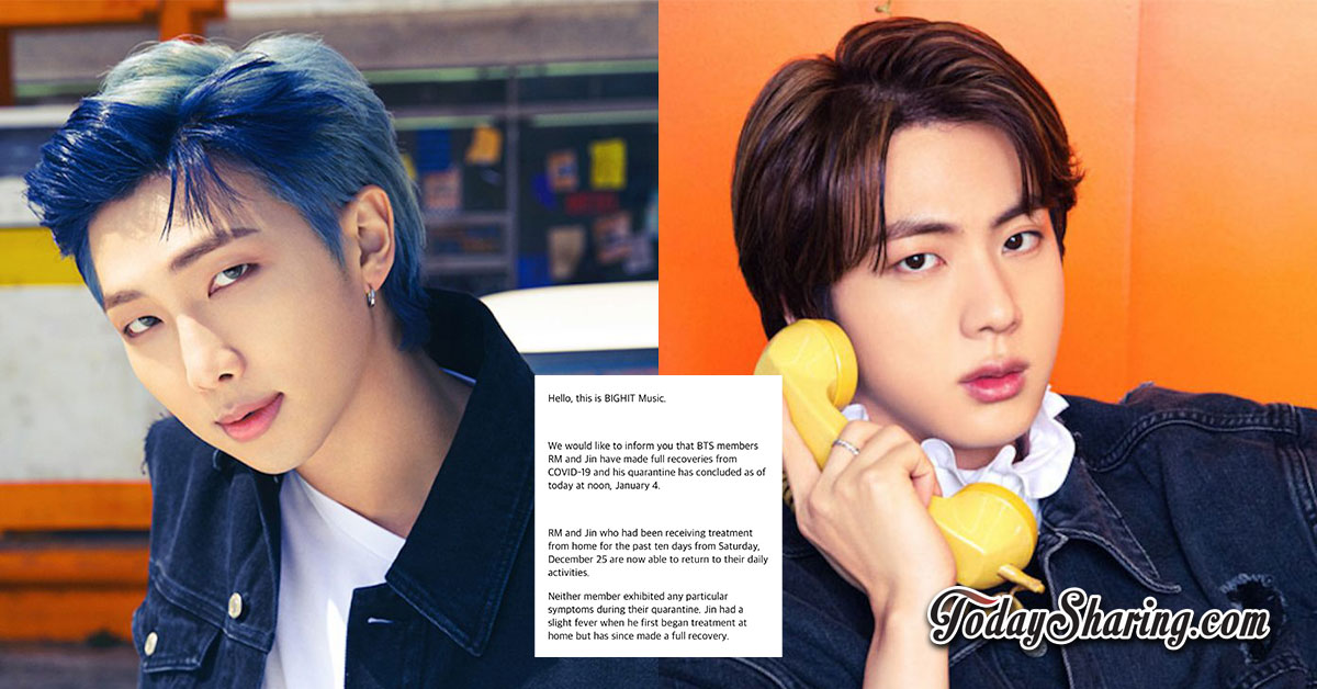 ថ្មីៗនេះ (ថ្ងៃទី ៤ ខែមករា) ក្រុមហ៊ុន Bighit Entertainment បានចេញប្រកាសជាផ្លូវការនៅលើទំព័រ Weverse​ ថាសមាជិកក្រុម BTS’s  RM និង Jin ជាស៉ះស្បើយពីជម្ងឺកូវិដ​១៩ពេញលេញ 100%  ហើយពេលវេលាចត្តាឡិស័ករបស់ពួកគេក៏នឹងត្រូវបញ្ចប់នៅពេលរសៀលថ្ងៃនេះផងដែរ បន្ទាប់ពីបានធ្វើការព្យាបាលនៅផ្ទះអស់រយៈពេល ១០ថ្ងៃគិតចាប់ពីថ្ងៃទី ២៥ ខែធ្នូ កន្លងមកនេះ។