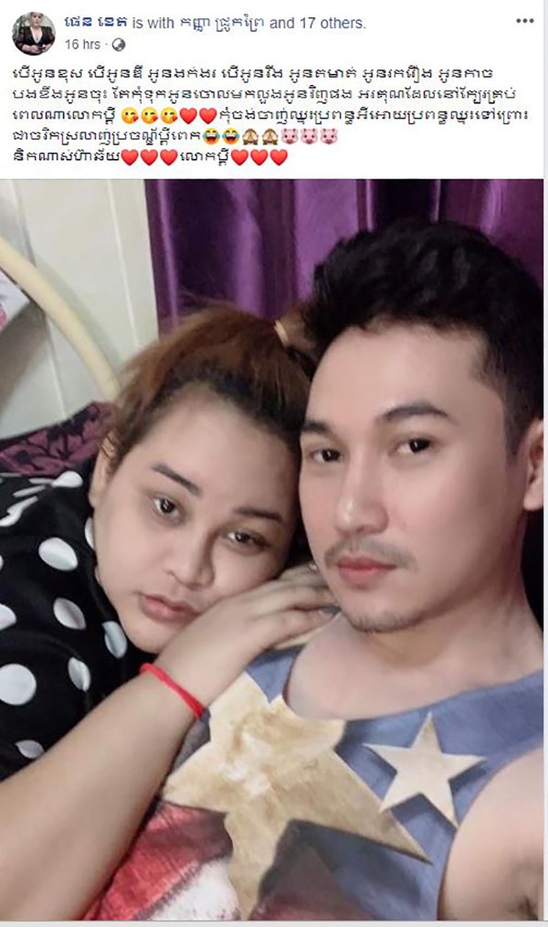 ក្នុងនោះផងដែរ ផេន ខេត បានបង្ហោះសាររៀបរាប់ថា៖ «បើអូនខុស បើអូនឌឺ អូនងក់ងរ បើអូនរឹង អូនតមាត់ អូនរករឿង អូនកាច បងខឹងអូនចុះ តែកុំទុកអូនចោលមកលួងអូនវិញផង អរគុណដែលនៅក្បែរគ្រប់ពេលណាលោកប្ដី កុំចង់ចាញ់ឈ្នះប្រពន្ធអីឲ្យប្រពន្ធឈ្នះទៅព្រោះជាចរិកស្រលាញ់ប្រចណ្ឌ័ប្ដីពេក នឹកណាស់ហ៊ាឆ័យ លោកប្ដី»។