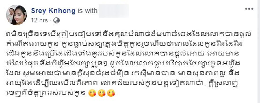 តាមរយៈសារនេះបានធ្វើឲ្យមហាជនជាច្រើនសរសើរដ៏ទឹកចិត្តអ្នកនាង ខ្ញុង ដែលខិតខំប្រឹងប្រែងដើម្បីទិញរថយន្តទំនើបជូនឪពុកបានសម្រេច៕