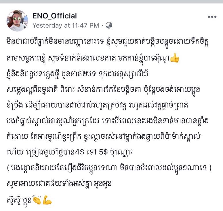 ក្នុងនោះលោក អុីណូ បានប្រកាសថា «មិនថាជាប់ឬធ្លាក់មិនមានបញ្ហានោះទេ ខ្ញុំសូមជួយគាត់បន្តិចបន្ទួចដោយទឹកចិត្តតាមសមត្ថភាពខ្ញុំ សូមទំនាក់ទំនងលេខគាត់ មកកាន់ខ្ញុំបាទអ៊ីណូ។ ខ្ញុំនឹងនិពន្ធបទភ្លេងថ្មី ជូនគាត់២បទ ទុកជាអនុស្សាវរីយ៍ សម្លេងល្អពីធម្មជាតិពីរោះ សំខាន់ការកែខៃបន្តិចតើ ប៉ុន្តែបងចង់ឲ្យប្អូនខំប្រឹង ដើម្បីឲ្យបានជាប់ជាប់រហូតគ្រប់វគ្គ រហូតដល់វគ្គផ្តាច់ព្រ័ត្ត បងក៏ធ្លាប់ស្គាល់អារម្មណ៍អ្នកក្រដែរ ទោះបីពេលនេះបងមិនទាន់មានបានខ្លាំងក៏ដោយ តែអារម្មណ៍ខ្វះព្រឹក ខ្វះល្ងាចរស់នៅម្នាក់ឯងឆ្ងាយពីប៉ាម៉ាក់ស្គាល់ហើយ ច្រៀងមួយថ្ងៃបាន៤$ ទៅ ៥$ ប៉ុណ្ណោះ ( បងផ្តោតនិយាយតែរឿងជីវិតប្អូនទេណា មិនបានប៉ះពាល់ដល់ប្អូនៗណាទេ ) សូមឲ្យជោគជ័យទាំងអស់គ្នា អូនអូន ស៊ូស៊ូ ប្អូន»។