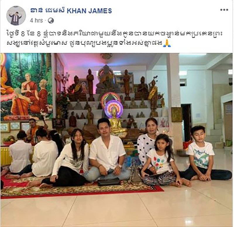 ជាក់ស្ដែងកាលពីប៉ុន្មានម៉ោងមុននេះ លោកបានបង្ហោះរូបភាពមួយសន្លឹក ក្នុងសកម្មភាពលោកទៅធ្វើបុណ្យនៅឯវត្តសំបួរមាស ជាមួយនិងគ្រួសារ​ មើលទៅពិតជាមានសុភមង្គលខ្លាំងណាស់។