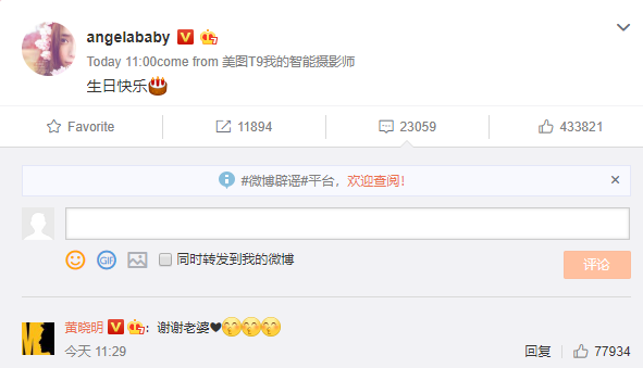 ប៉ុន្ដែក្រោយពីបានឃើញតារាស្រីរូបស្រស់នេះ បង្ហោះសារជូនពរថ្ងៃខួបកំណើតដល់ស្វាមីនាងនៅលើបណ្ដាញសង្គម Weibo និងមានការឆ្លើយតបយ៉ាងផ្អែមល្ហែមពីស្វាមីរបស់នាងថា «អរគុណប្រពន្ធសំលាញ់» នៅខាងក្រោមសារនោះផងដែរ ទើបធ្វើឲ្យប្រិយមិត្តដែលជាអ្នកគាំទ្រប្ដីប្រពន្ធមួយគូនេះ ធូរទ្រូខ្សាកតែម្ដង ពីព្រោះថាបើសិនជាចំណងអាពាហ៍ពិពាហ៍របស់ពួកគេពិតជាប្រេះឆាដូចពាក្យចចាមអារ៉ាមមែននោះ Angelababy ប្រហែលជាមិនខ្វល់នឹងថ្ងៃកំណើតរបស់ស្វាមីខ្លួនលោក Huang Xiao Ming នោះទេ៕