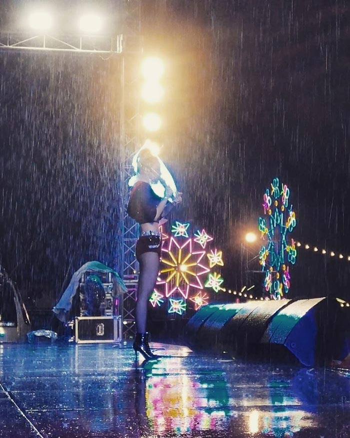 នាងផុសរូបព្រមទាំងសរសេរថា ” បុិសស្លាប់ មិនមែនដោយសារខ្សែរភ្លើងឆក់ទេតែមកពីដកដង្ហើមមិនរួច! សូមអរគុណដល់ហ្វេនៗដែលបារម្មណ៍ពីសុខភាពនិងសុវត្ថិភាពនាងខ្ញុំ។ មិនបាច់បារម្មណ៍ទេ បើហ្វេនៗសុខចិត្តឈរមើលតារាៗសម្តែងក្រោមភ្លៀងធ្លាក់បាន រឿងអ្វីដែលតារាៗមិនអាចឡើងសម្តែងបាន ” ។