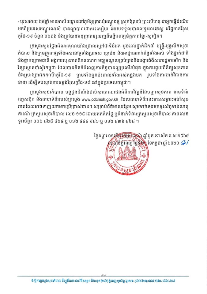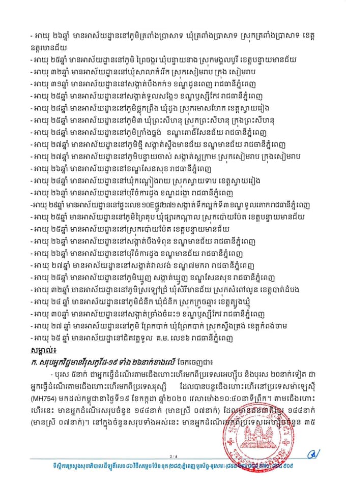 ក្នុងករណីវិជ្ជមាន COVID-19 ថ្មី នេះគឺជាបុរសជនជាតិខ្មែរទាំងអស់ ដែលអ្នកទាំងនោះបានធ្វើដំណើរវិលត្រឡប់ពីប្រទេសអេហ្ស៊ីប ៥ នាក់ និងរុស្សី ២០ នាក់ ដែលបានបន្តជើងហោះហើរនៅប្រទេសម៉ាឡេស៊ី (MH754) មកដល់កម្ពុជានាថ្ងៃទី១៩ ខែ កក្កដា ឆ្នាំ ២០២០ វេលាម៉ោង ១០:៤០ នាទីព្រឹក។ ចំណែកបុរសម្នាក់ទៀតជាអ្នកដំណើរមកកូរ៉េខាងត្បូង។