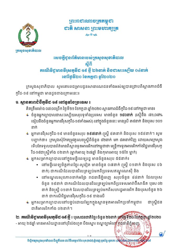 បើតាមការប្រកាសរបស់ក្រសួងសុខាភិបាល ថ្ងៃ ២១ ខែ កក្កដា ឆ្នាំ ២០២០ នេះបានរកឃើញករណីវិជ្ជមាន COVID-19 ថ្មី ២៦ នាក់បន្ថែមទៀត ដែលជាអ្នកធ្វើដំណើរមកពីប្រទេសអេហ្ស៊ីប រុស្សី និងអាកាសចរណ៍កូរ៉េ។