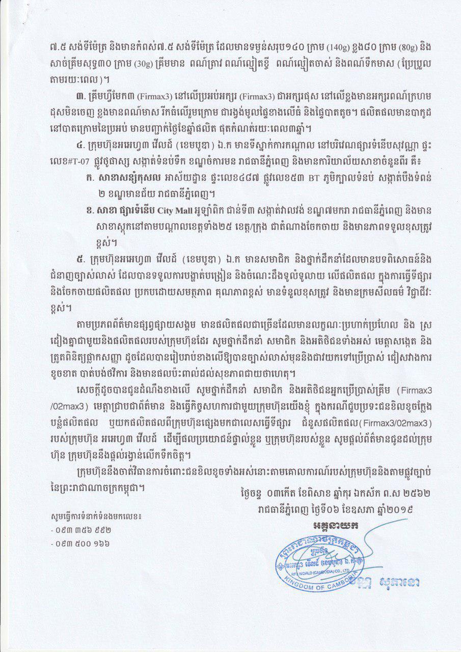 សូមរំលឹកថា តាមប្រភពព័ត៌មានផ្សព្វផ្សាយលើបណ្តាញសង្គម មានផលិតផលជាច្រើនមានលក្ខណៈប្រហាក់ប្រហែលនិងស្រដៀងគ្នាជាមួយនឹងផលិតផល Firmax3 និង O2max3 ហេតុដូច្នេះសូមសាធារណជន ថ្នាក់ដឹកនាំ សមាជិកតំណាងក្រុមហ៊ុនទាំងអស់គ្នា មេត្តាសង្កេតនិងត្រួតពិនិត្យផ្លាកសញ្ញាឱ្យច្បាស់ាលាស់ មុននឹងជាវឬប្រើប្រាស់ដើម្បីជៀសវាសបាត់បង់ថវិកានិងប៉ះពាល់ដល់សុខភាព៕