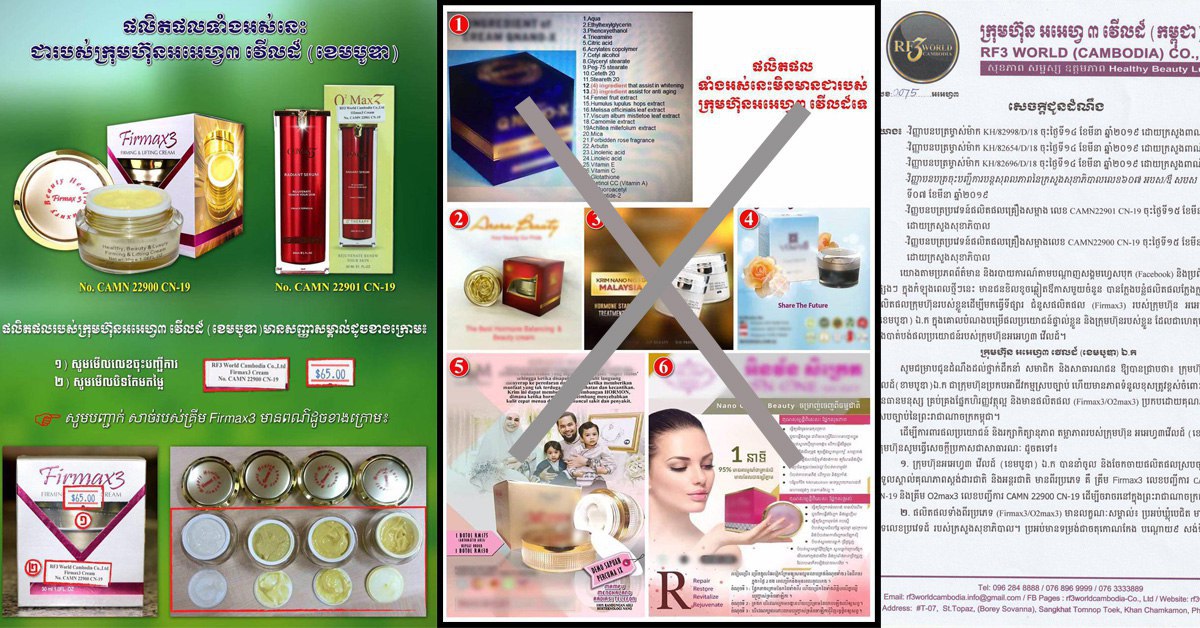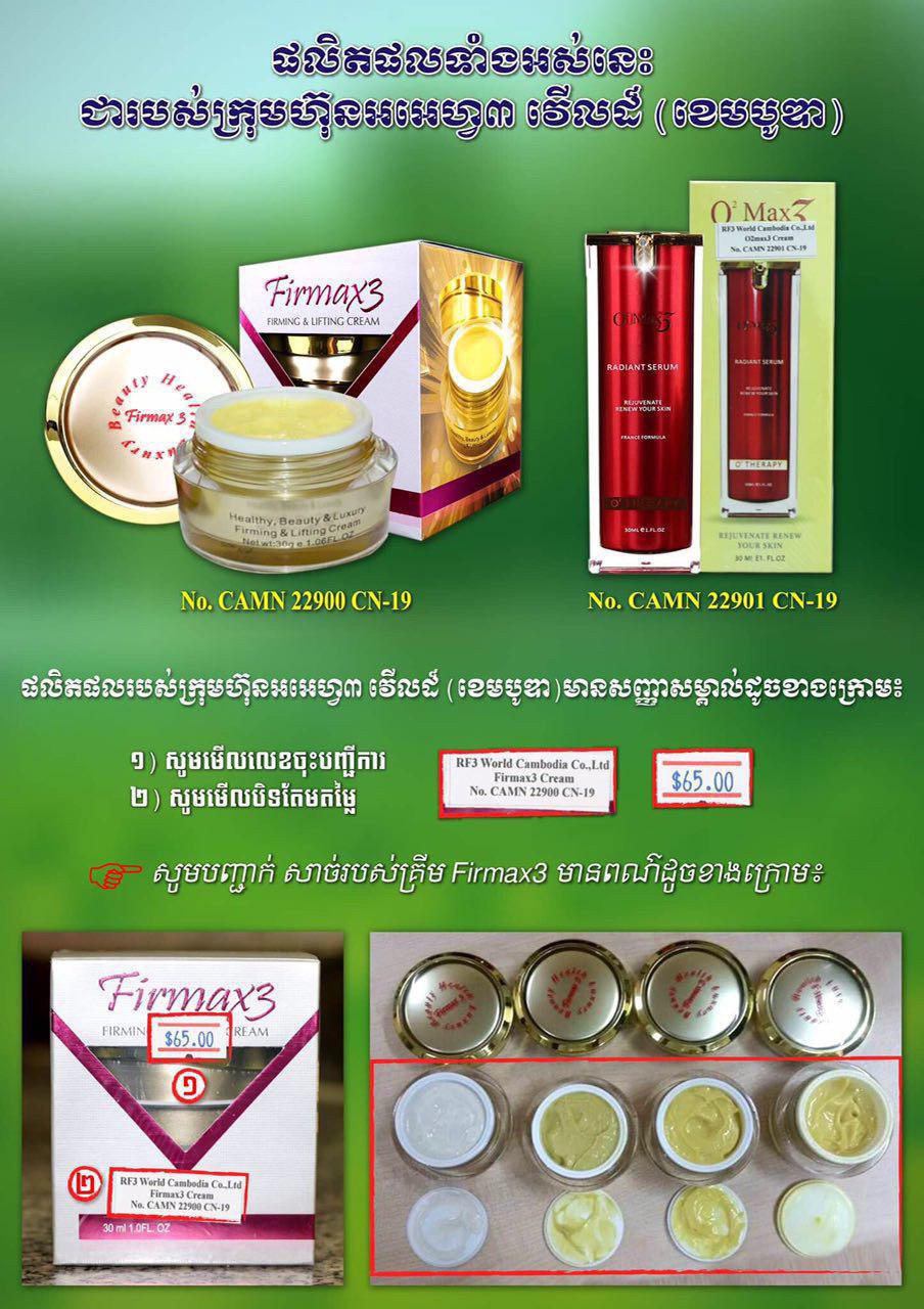 ក្រោយពីទទួលពីរបាយការណ៍ និង មើលឃើញមានជនខិលខូចប្រើការផ្សព្វផ្សាយលើបណ្តាញសង្គម ឆរបោកប្រជាពលរដ្ឋក្រោមរូបភាពក្លែងបន្លំជាក្រុមហ៊ុន RF3 World Cambodia នោះ ក្រុមហ៊ុនសម្រេចធ្វើការជូនដំណឹងយ៉ាងច្បាស់លាស់ថា ក្រុមហ៊ុន RF3 World Cambodia មានតែផលិតផលចំនួនពីរមុខប៉ុណ្ណោះដែលបំរើសុខភាពពិតៗគឺ Firmax3 និង O2max3 ទទួលស្គាល់និងចុះបញ្ចីការពីក្រសួងសុខាភិបាលដើម្បីចរាចរណ៍នៅកម្ពុជា។