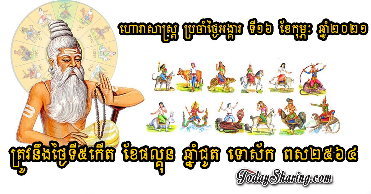 ហោរាសាស្រ្ត ប្រចាំថ្ងៃ អង្គារ ទី ១៦ ខែ កុម្ភៈ ឆ្នាំ ២០២១ ត្រូវនឹងថ្ងៃទី ៥កើត ខែផល្គុន ឆ្នាំជូត ទោស័ក ពស២៥៦៤