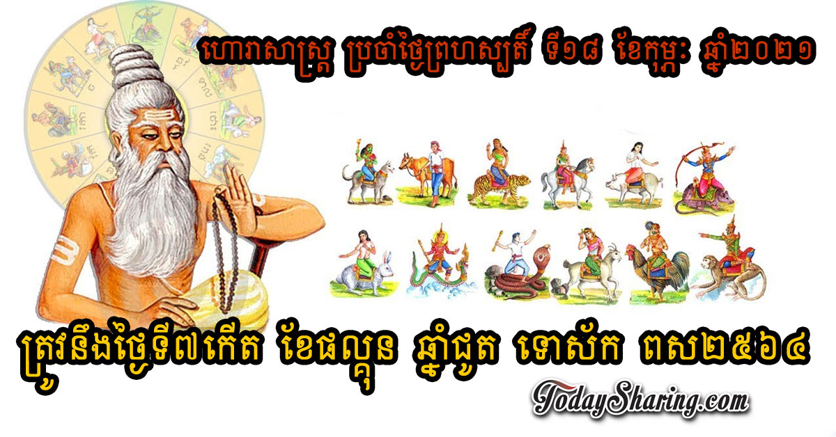 ហោរាសាស្រ្ត ប្រចាំថ្ងៃ ព្រហស្បតិ៍ ទី ១៨ ខែ កុម្ភៈ ឆ្នាំ ២០២១ ត្រូវនឹងថ្ងៃទី ៧កើត ខែផល្គុន ឆ្នាំជូត ទោស័ក ពស២៥៦៤