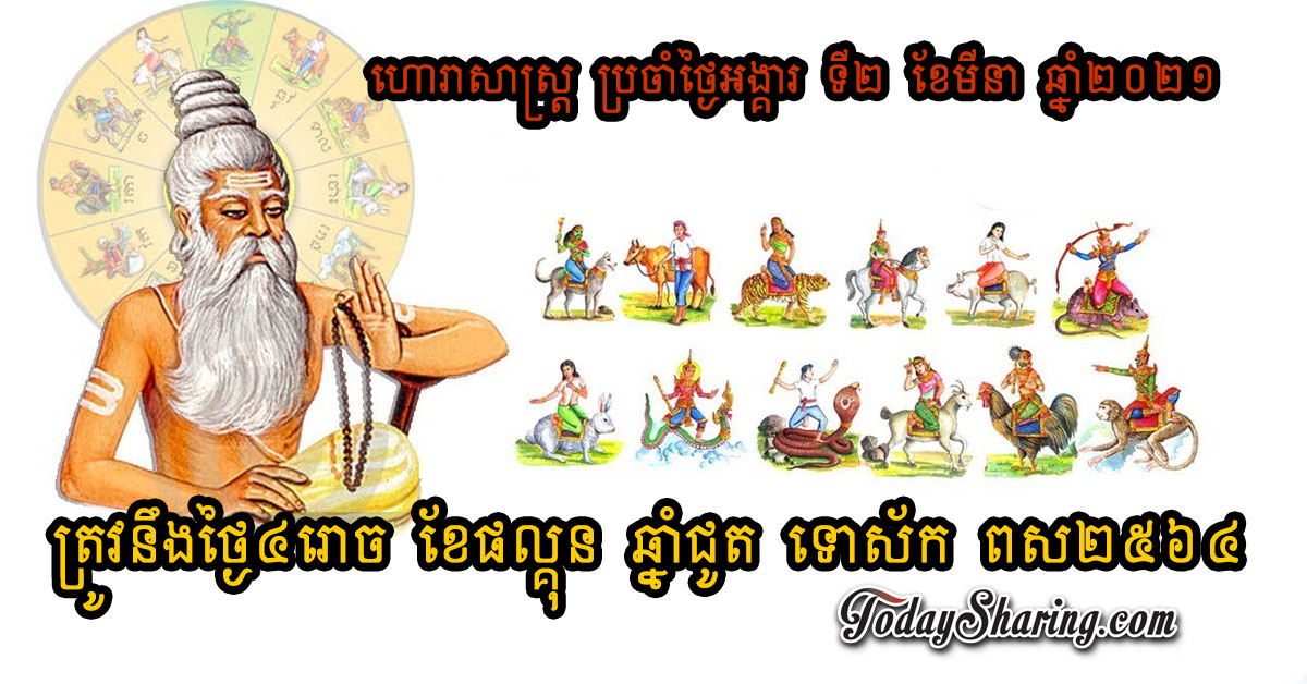 ហោរាសាស្រ្ត ប្រចាំថ្ងៃូ អង្គារ ទី ២ ខែ មីនា ឆ្នាំ២០២១ ត្រូវនឹងថ្ងៃទី ៤រោច ខែផល្គុន ឆ្នាំជូត ទោស័ក ពស២៥៦៤