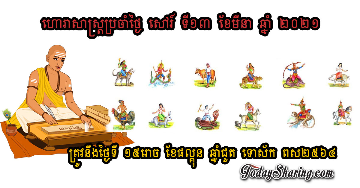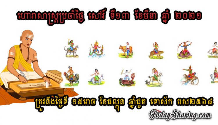 ហោរាសាស្រ្ត ប្រចាំថ្ងៃ សៅរ៍ ទី ១៣ ខែ មីនា ឆ្នាំ ២០២១ ត្រូវនឹងថ្ងៃទី ១៥រោច ខែផល្គុន ឆ្នាំជូត ទោស័ក ពស២៥៦៤