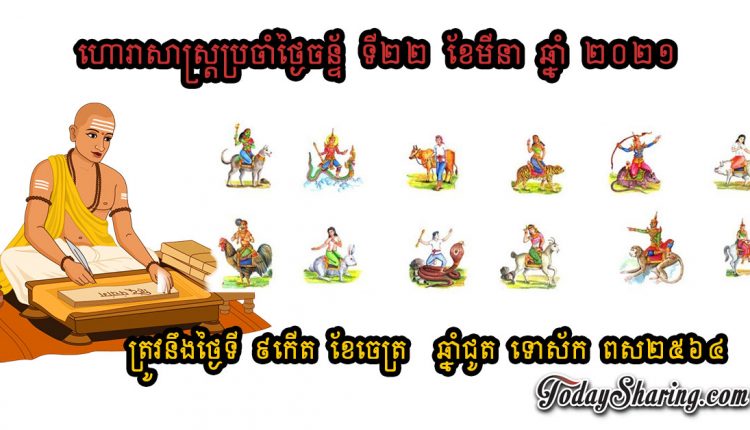 ហោរាសាស្រ្ត ប្រចាំថ្ងៃ ច័ន្ទ ទី ២២ ខែ មីនា ឆ្នាំ ២០២១ ត្រូវនឹងថ្ងៃទី ៩កើត ខែចេត្រ ឆ្នាំជូត ទោស័ក ពស២៥៦៤