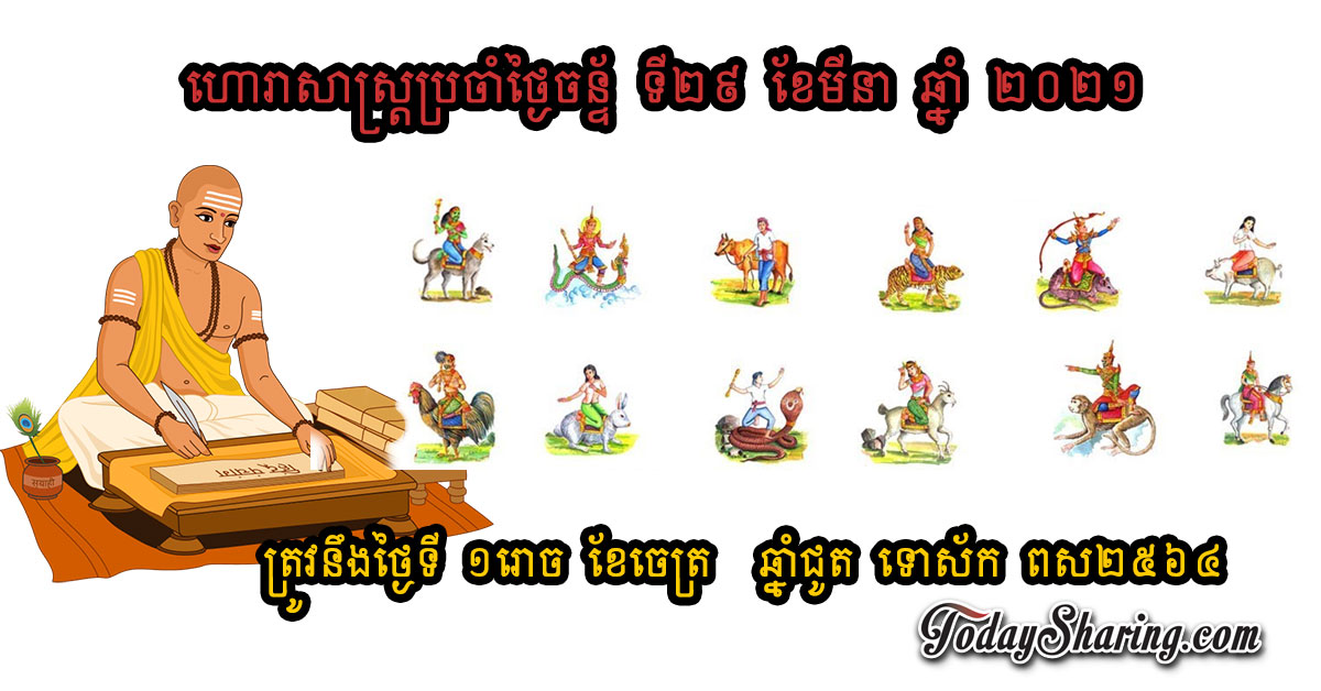 ហោរាសាស្រ្ត ប្រចាំថ្ងៃ ច័ន្ទ ទី ២៩ ខែ មីនា ឆ្នាំ ២០២១ ត្រូវនឹងថ្ងៃទី ១រោច​ ខែចេត្រ ឆ្នាំជូត ទោស័ក ពស២៥៦៤