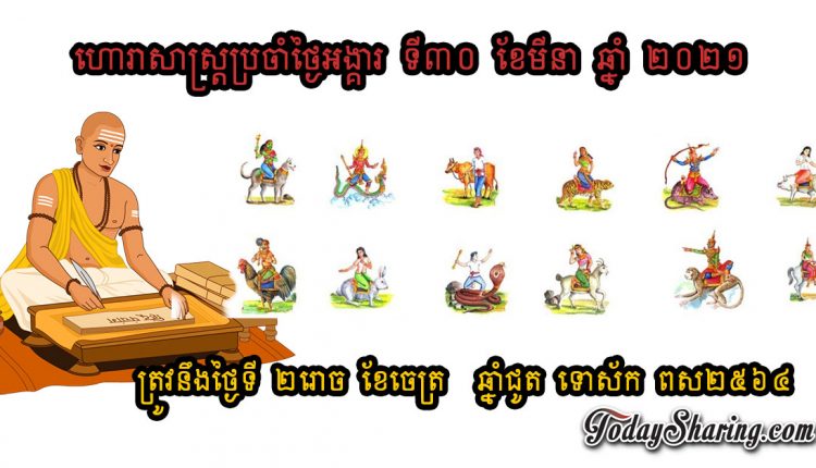 ហោរាសាស្រ្ត ប្រចាំថ្ងៃ អង្គារ ទី ៣០ ខែ មីនា ឆ្នាំ ២០២១ ត្រូវនឹងថ្ងៃទី ២រោច ខែចេត្រ ឆ្នាំជូត ទោស័ក ពស២៥៦៤