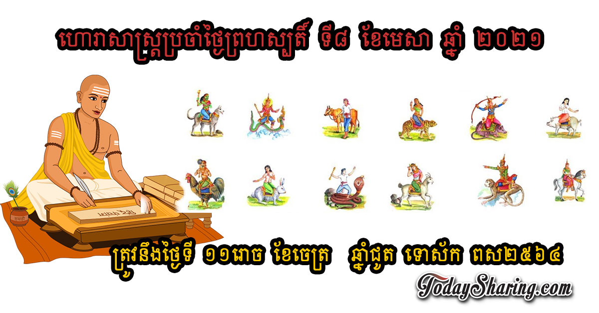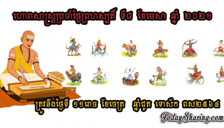 ហោរាសាស្រ្ត ប្រចាំថ្ងៃ ព្រហស្បតិ៍ ទី ៨ ខែ មេសា ឆ្នាំ ២០២១ ត្រូវនឹងថ្ងៃ ១១រោច ខែចេត្រ ឆ្នាំជូត ទោស័ក ពស២៥៦៤