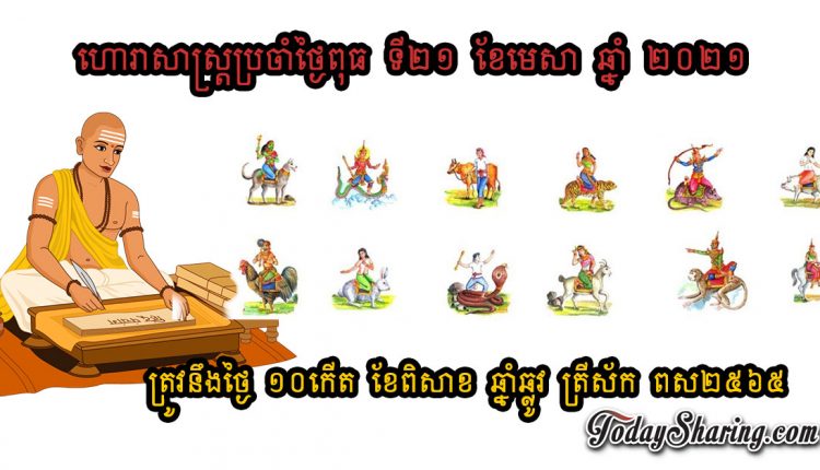 ហោរាសាស្រ្ត ប្រចាំថ្ងៃ ពុធ ទី ២១ ខែ មេសា ឆ្នាំ ២០២១ ត្រូវនឹងថ្ងៃ ១០កើត ខែពិសាខ ឆ្នាំឆ្លូវ ត្រីស័ក ពស២៥៦៥