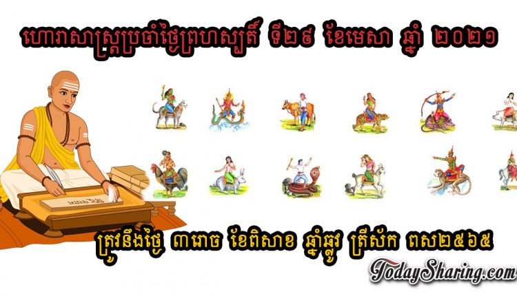 ហោរាសាស្រ្ត ប្រចាំថ្ងៃ ព្រហស្បតិ៍ ទី ២៩ ខែ មេសា ឆ្នាំ ២០២១ ត្រូវនឹងថ្ងៃ ៣រោច ខែពិសាខ ឆ្នាំឆ្លូវ ត្រីស័ក ពស២៥៦៥
