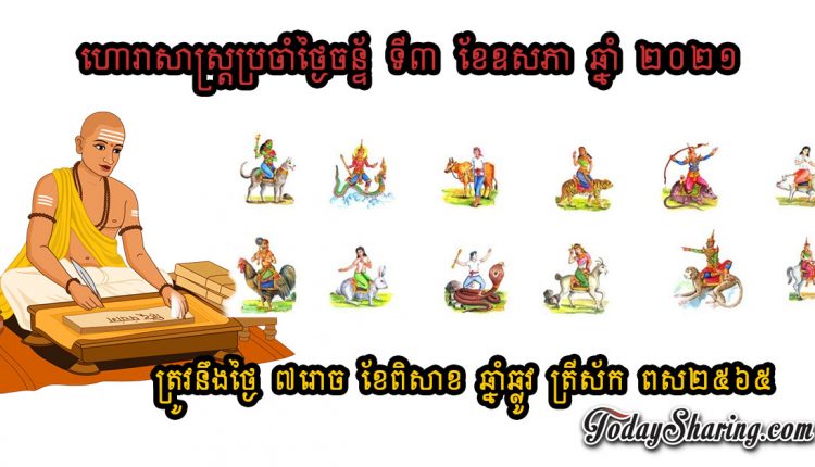 ហោរាសាស្រ្ត ប្រចាំថ្ងៃ ច័ន្ទ ទី ៣ ខែ ឧសភា ឆ្នាំ ២០២១ ត្រូវនឹងថ្ងៃ ៧រោច ខែពិសាខ ឆ្នាំឆ្លូវ​ ត្រីស័ក ពស២៥៦៥
