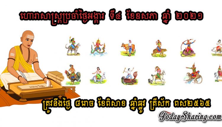 ហោរាសាស្រ្ត ប្រចាំថ្ងៃ អង្គារ ទី ០៤ ខែ ឧសភា ឆ្នាំ ២០២១ ត្រូវនឹងថ្ងៃ ៨រោច ខែពិសាខ ឆ្នាំឆ្លូវ ត្រីស័ក ពស២៥៦៥