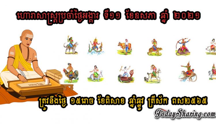 ហោរាសាស្រ្ត ប្រចាំថ្ងៃ អង្គារ ទី ១១ ខែ ឧសភា ឆ្នាំ ២០២១ ត្រូវនឹងថ្ងៃ ១៥រោច ខែពិសាខ​ ឆ្នាំឆ្លូវ ត្រីស័ក ពស២៥៦៥
