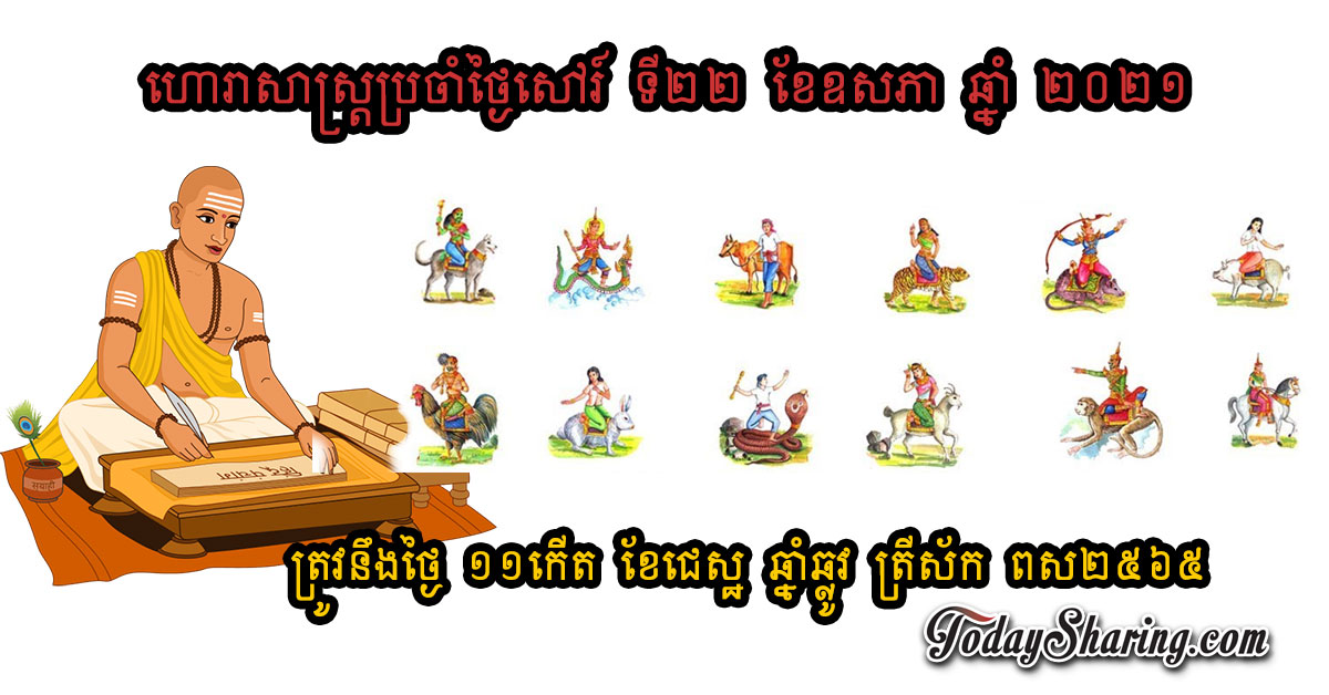 ហោរាសាស្រ្ត ប្រចាំថ្ងៃ សៅរ៍ ទី ២២ ខែ ឧសភា ឆ្នាំ ២០២១ ត្រូវនឹងថ្ងៃ ១១កើត ខែជេស្ឋ ឆ្នាំឆ្លូវ ត្រីស័ក ពស២៥៦៥