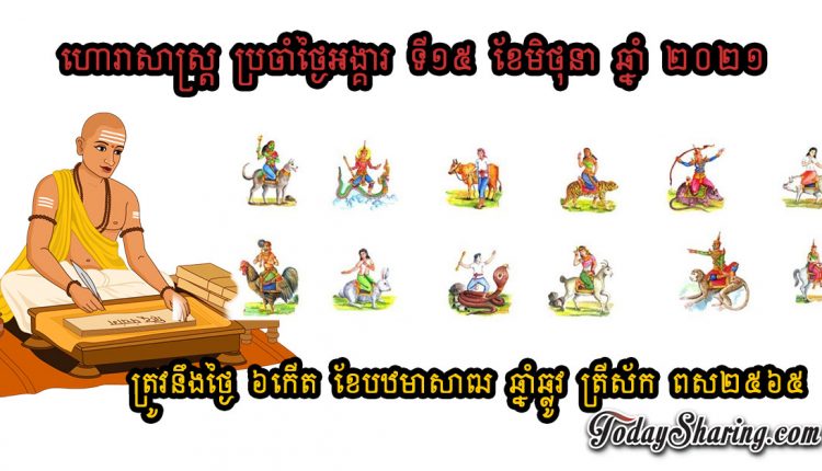 ហោរាសាស្រ្ត ប្រចាំថ្ងៃ អង្គារ ទី ១៥ ខែ មិថុនា ឆ្នាំ ២០២១ ត្រូវនឹងថ្ងៃ ៦កើត ខែបឋមាសាឍ ឆ្នាំឆ្លូវ ត្រីស័ក ពស២៥៦៥