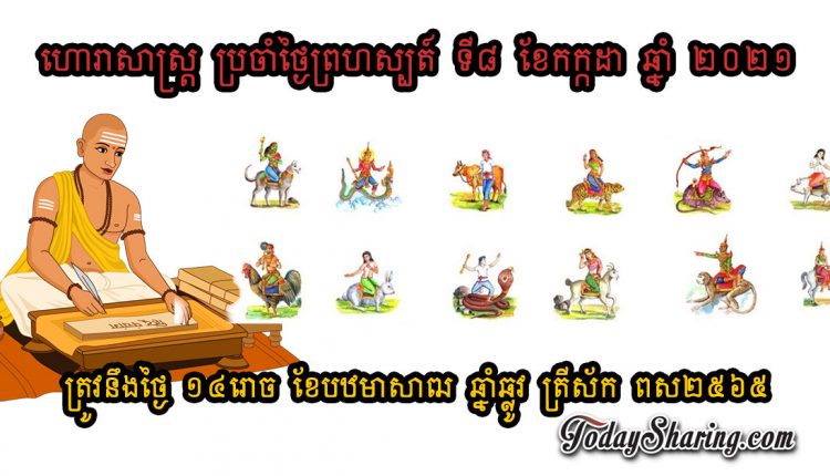 ហោរាសាស្រ្ត ប្រចាំថ្ងៃ ព្រហស្បតិ៍ ទី ០៨ ខែ កក្កដា ឆ្នាំ ២០២១ ត្រូវនឹងថ្ងៃ ១៤រោច ខែបឋមាសាឍ ឆ្នាំឆ្លូវ ត្រីស័ក ពស២៥៦៥