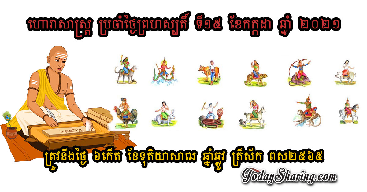 ហោរាសាស្រ្ត ប្រចាំថ្ងៃ ព្រហស្បតិ៍ ទី ១៥ ខែ កក្កដា ឆ្នាំ ២០២១ ត្រូវនឹងថ្ងៃ ៦កើត ខែទុតិយាសាឍ ឆ្នាំឆ្លូវ ត្រីស័ក ពស២៥៦៥