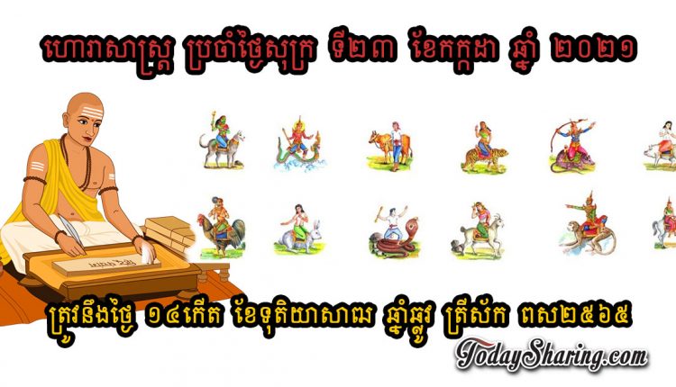 ហោរាសាស្រ្ត ប្រចាំថ្ងៃ សុក្រ ទី ២៣ ខែ កក្កដា ឆ្នាំ ២០២១ ត្រូវនឹងថ្ងៃ១៤កើត ខែទុតិយាសាឍ ឆ្នាំឆ្លូវ ត្រីស័ក ពស២៥៦៥