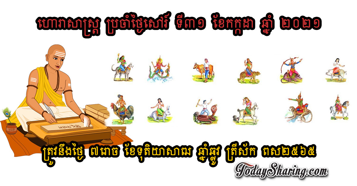 ហោរាសាស្រ្ត ប្រចាំថ្ងៃ សៅរ៍ ទី ៣១ ខែ កក្កដា ឆ្នាំ ២០២១ ត្រូវនឹងថ្ងៃ៧រោច ខែទុតិយាសាឍ ឆ្នាំឆ្លូវ ត្រីស័ក ពស២៥៦៥