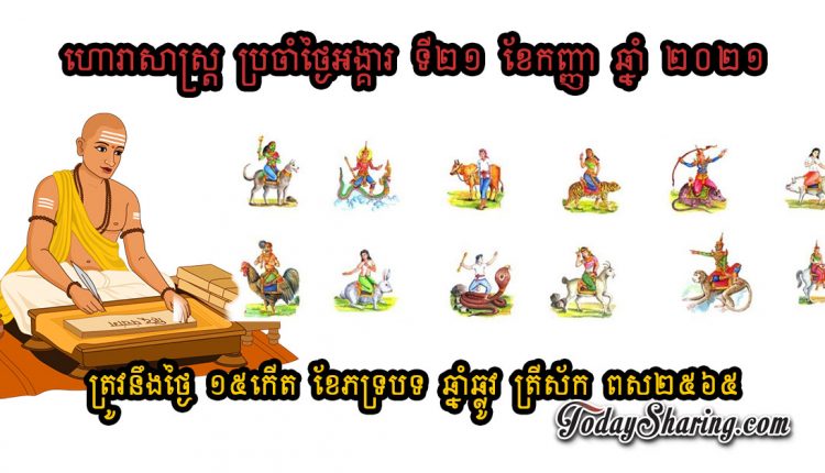 ហោរាសាស្រ្ត ប្រចាំថ្ងៃ អង្គារ ទី ២១ ខែ កញ្ញា ឆ្នាំ ២០២១ ត្រូវនឹងថ្ងៃ ១៥កើត ខែភទ្របទ ឆ្នាំឆ្លូវ ត្រីស័ក ពស២៥៦៥