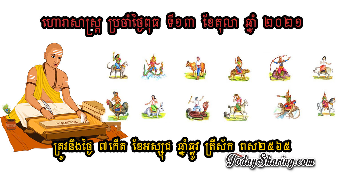 ហោរាសាស្រ្ត ប្រចាំថ្ងៃ ពុធ ទី ១៣ ខែ តុលា ឆ្នាំ ២០២១ ត្រូវនឹងថ្ងៃ ៧កើត ខែអស្សុជ ឆ្នាំឆ្លូវ ត្រីស័ក ពស២៥៦៥