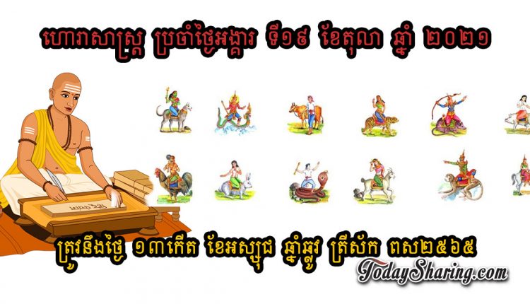 ហោរាសាស្រ្ត ប្រចាំថ្ងៃ អង្គារ ទី ១៩ ខែ តុលា ឆ្នាំ ២០២១ ត្រូវនឹងថ្ងៃ ១៣កើត ខែអស្សុជ ឆ្នាំឆ្លូវ ត្រីស័ក ពស២៥៦៥