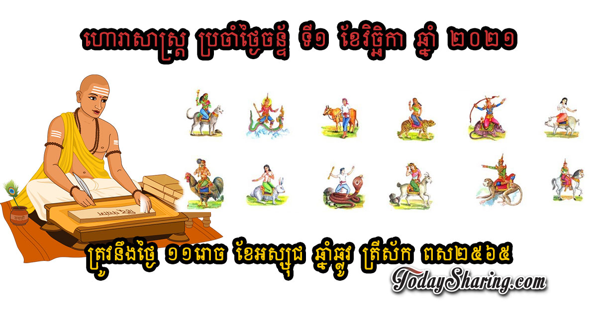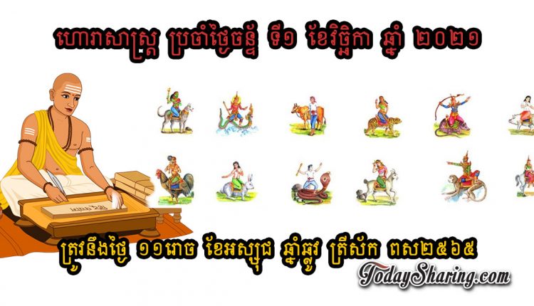 ហោរាសាស្រ្ត ប្រចាំថ្ងៃ ច័ន្ទ ទី ០១ ខែ វិច្ឆិកា ឆ្នាំ ២០២១ ត្រូវនឹងថ្ងៃ១១រោច ខែអស្សុជ ឆ្នាំឆ្លូវ ត្រីស័ក ពស២៥៦៥