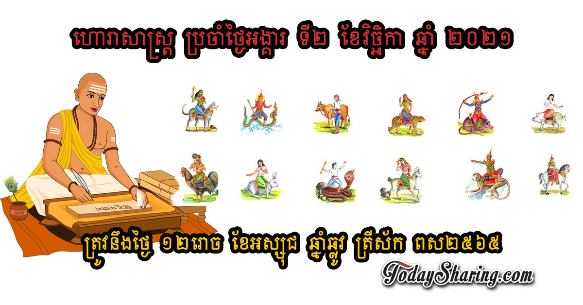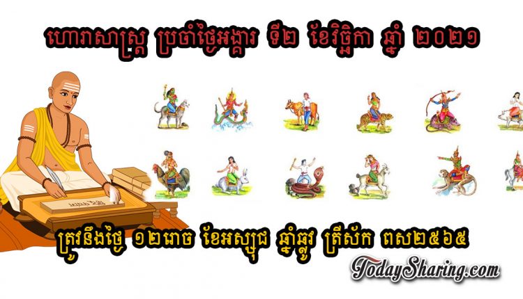 ហោរាសាស្រ្តប្រចាំថ្ងៃ អង្គារ ទី ០២ ខែ វិច្ឆិកា ឆ្នាំ ២០២១ ត្រូវនឹងថ្ងៃ ១២រោច ខែអស្សុជ ឆ្នាំឆ្លូវ ត្រីស័ក ពស២៥៦៥