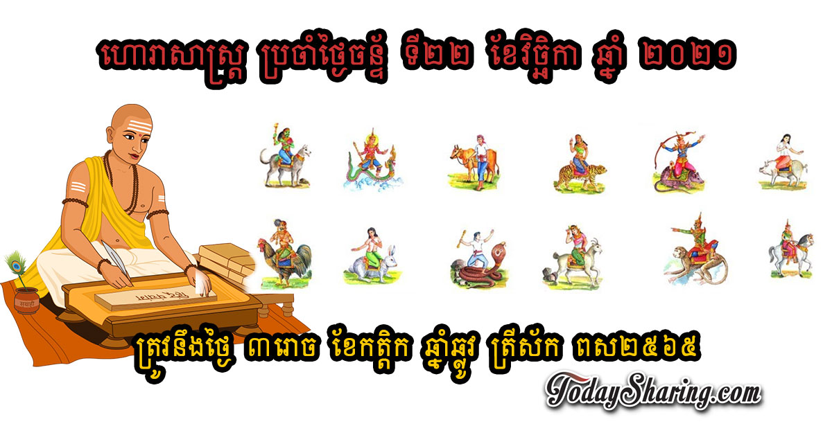 ហោរាសាស្រ្ត ប្រចាំថ្ងៃ ច័ន្ទ ទី ២២ ខែ វិច្ឆិកា ឆ្នាំ ២០២១ ត្រូវនឹងថ្ងៃ ៣រោច ខែកត្តិក ឆ្នាំឆ្លូវ ត្រីស័ក ពស២៥៦៥