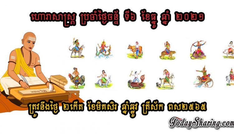 ហោរាសាស្រ្ត ប្រចាំថ្ងៃ ច័ន្ទ ទី ០៦ ខែ ធ្នូ ឆ្នាំ ២០២១ ត្រូវនឹងថ្ងៃ ២កើត ខែមិគសិរ ឆ្នាំឆ្លូវ ត្រីស័ក ពស២៥៦៥